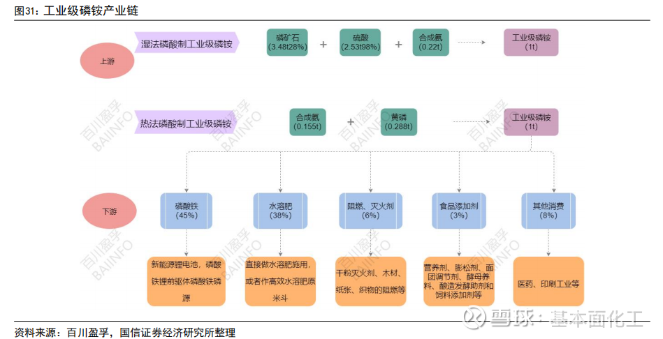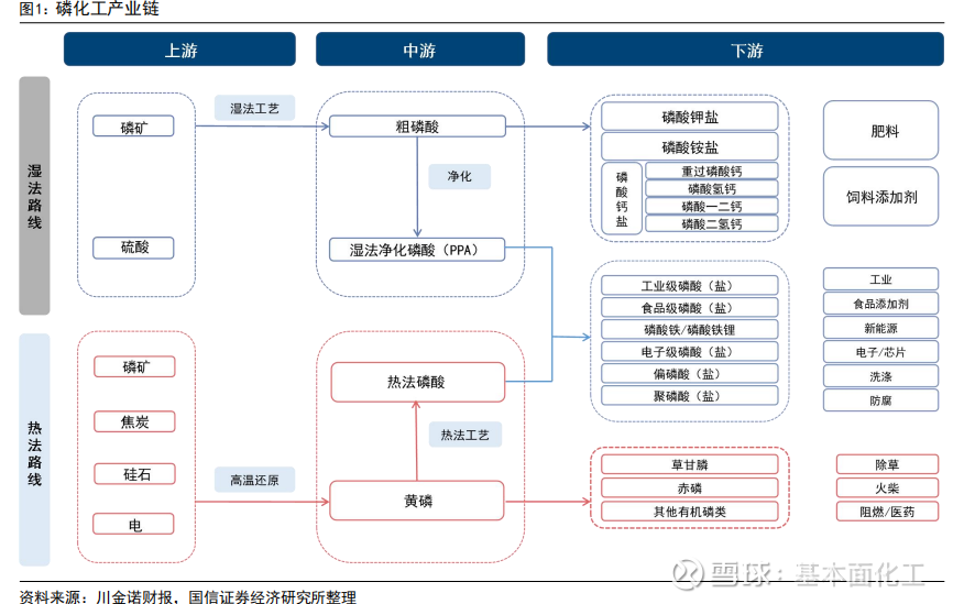 磷化工产业链包含湿法与热法两条核心技术路线。湿法路线上游以磷矿、硫酸为原料,经湿法工艺制得粗磷酸并净化为湿法净化磷酸(PPA),可进一步加工为磷酸钙盐、各类工业及食品级磷酸(盐)等产品,广泛应用于肥料、饲料添加剂、工业、食品添加剂、新能源等领域;热法路线上游以磷矿、焦炭、硅石、电力为原料,经高温还原生成黄磷,再通过热法工艺制备热法磷酸,进一步加工为各类磷酸盐,黄磷还可用于生产草甘膦、赤磷等产品,应用于除草、火柴、阻燃/医药等场景,两条路线并行支撑了磷化工从基础原料到精细化学品的全链条供给,覆盖农业、工业、新能源、医药等多元下游需求。