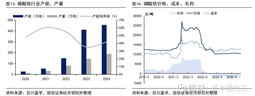 磷酸铁需求明显回暖,景气度有望提升。据百川盈孚,截至2025年10月,国内磷酸铁行业产能达482万吨,2024年以来行业新增产能投放节奏明显放缓,但目前仍面临产能过剩问题,自2023年7月磷酸铁价格首次跌破成本线以来,磷酸铁生产的毛利润为负值已持续超两年。2020-2024年,中国磷酸铁行业经历爆发式扩张,产能从26.5万吨激增至455.8万吨,产量由12.7万吨跃升至189.4万吨,年均复合增速超95%,产能利用率在2023年一度降至35.1%的低位,反映阶段性产能过剩;但受益于磷酸铁锂电池在动力与储能领域的持续渗透,2024年需求明显回暖,产能利用率回升至41.5%。展望2025-2027年,尽管规划新增产能仍较多,但大量项目受制于磷矿资源审批、环评约束、资金压力及下游订单落地节奏,实际投产比例可能显著低于规划水平;叠加头部企业凭借“磷矿-净化磷酸-磷酸铁”一体化优势加速扩产,行业或存在名义产能虚高、有效供给集中的现象。预计2025年磷酸铁表观消费量增速或超过50%,整体产能利用率提升至57%左右,2026-2027年供需情况需关注新增产能落地节奏。