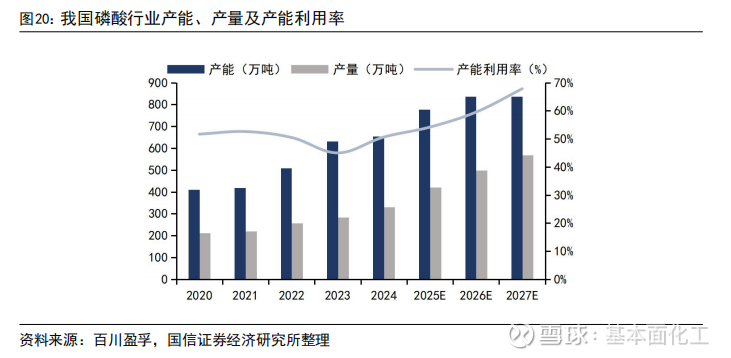工业级磷酸一铵产能持续扩张,高端需求有望驱动利用率回升。近年来,我国工业级磷酸一铵行业整体呈现产能稳步扩张但利用率长期偏低。2020-2024年,行业产能由276万吨增至384万吨,年均复合增速约8.6%,但同期产能利用率始终徘徊在40%-50%区间,反映出结构性过剩与有效需求不足并存的矛盾。一方面,大量中小厂商以低端二水法工艺生产普通工业级产品,同质化严重;另一方面,高纯消防级、电池级等高端产品供给集中于少数龙头企业,技术壁垒高、认证周期长。展望2026-2027年,假设百川盈孚统计的在建产能均顺利投产,产量增速保持在20%,行业产能利用率有望显著回升,预计从2024年的49.9%提升至2027年的73.6%,供需格局逐步转向紧平衡,具备高纯工艺和一体化成本优势的企业将率先受益。
