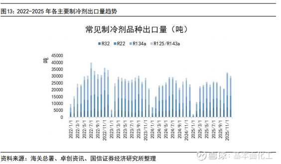 2025年,R22出口6.9万吨,同比下降15%;R32出口6.38万吨,同比增长12%;R134a出口12.11万吨,同比下降3%;R125总出口6.23万吨,同比下降23%。从出口数据来看,制冷剂海外需求持续增长以R32为主,R22受配额削减影响,同比下滑为正常趋势。从12月数据来看:R22同比增长43%,R32同比增长11%,R134a同比增长32%,R125同比下滑7%。