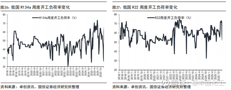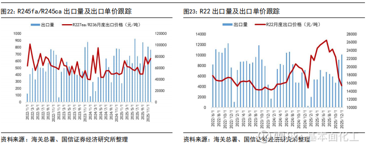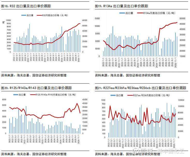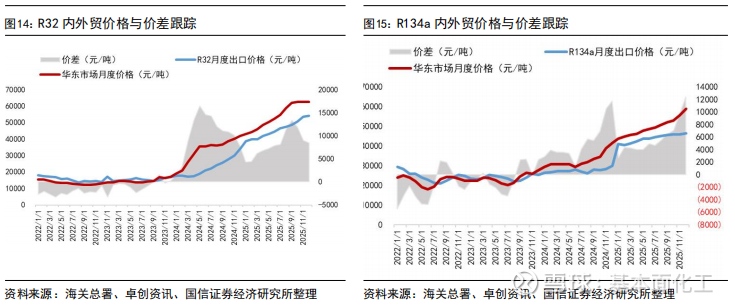 出口价格方面,截至2025年12月出口均价,R125、R32、R134a等产品外贸价格受海关出关、船运周期等因素影响,与内贸月度价格存在一定时滞,但国内外价格已实现趋同。具体来看,2025年12月R32出口均价为54047元/吨,R22出口均价为15358元/吨,R134a出口均价为46343元/吨,R125/R143系列出口均价为22412元/吨。
