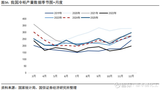 冷柜/冰柜:中物联冷链物流专委会公布的数据显示,2024年我国冷链需求总量预计达到3.65亿吨,同比增长4.3%,增速较2023年下降1.8pct,主要原因为肉类与水产进口降低、生鲜需求波动;冷链物流总收入预计达到5361亿元,同比增长3.7%,增速较2023年下降1.5pct。在国家及地方政府出台相关政策的引导以及市场需求的驱动下,公共冷库新建、改扩建、智能化改造进度加快。据中物联冷链委和链库平台不完全统计,2024年冷库项目资金投入474.14亿元,其中第四季度的冷库项目资金投入为109.07亿元。2024年冷库市场新增供应较为平稳,截至2024年,冷库总量为2.53亿立方米,同比增长10.96%,新增库容2491万立方米。冷库求租量为1759.53万立方米,同比增长16.51%,冷库出租量为3653.71万立方米,同比增长33.44%,供需剪刀差进一步拉大。受市场需求波动和供需关系影响,2024年上半年大部分城市冷库价格呈下降趋势,下半年趋于平稳,大部分城市的全年冷库空置率呈增长态势。受政策补贴和市场需求的带动,冷藏车销量恢复两位数增长,2024年冷藏车保有量预计达到49.5万辆,同比增长14.58%;冷藏车销量为62956辆,同比增长16.29%。随着国家及地方政府对新能源冷藏车辆的补贴政策出台,配套基础设施的不断完善以及其在路权、成本上的优势,新能源冷藏车销量爆发增长。据国家统计局数据,2025年12月全国冷柜产量297.6万台,同比增长9.0%;1-12月累计产量2356.70万台,同比增长0.9%。