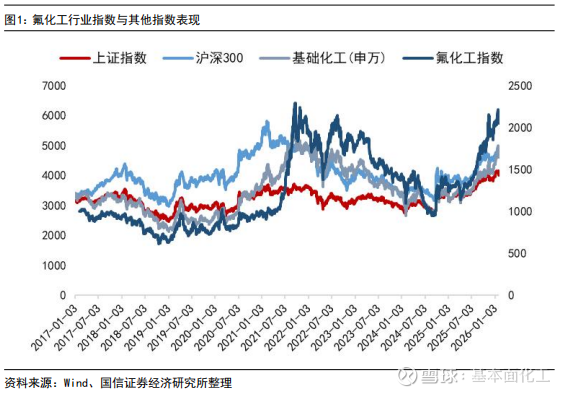 据我们编制的国信化工价格指数,截至2026年1月30日,国信化工氟化工价格指数、国信化工制冷剂价格指数分别报1271.391、1971.18点,分别较12月底+2.95%、+0.85%,1月萤石、无水氢氟酸、含氟高分子均价均有不同程度上涨。