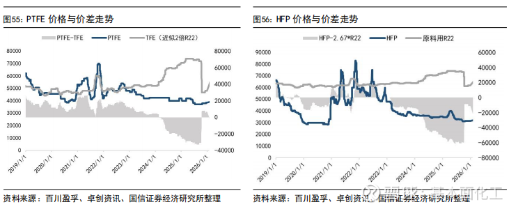 (1)PTFE方面,成本端持续上行进一步夯实底部。供应方面,替代品难以快速补充,行业整体供应偏紧,且企业库存处于相对低位。需求端节前囤货意向仍存,供需格局对价格存在上行驱动。截至2026年2月5日,悬浮中粒售价4.2-4.5万元/吨,悬浮细粉4.5-4.8万元/吨,分散树脂4.5-4.7万元/吨,分散乳液2.8-3.0万元/吨。