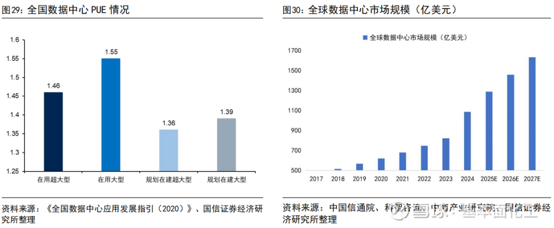 数据中心产业快速发展的同时,也带来了能耗大幅增长的问题。据《中国数据中心能耗现状白皮书》,2015年全国大数据中心的耗电量已达1000亿kWh,相当于三峡电站全年的发电量;2018年数值迅速爬升至1609亿kWh,超过上海全年的社会用电量。根据2020年国家工信部公布的《全国数据中心应用发展指引(2020)》,全国在用超大型数据中心平均PUE达1.46,大型数据中心平均PUE为1.55;2021年7月工信部公布《新型数据中心发展三年行动计划(2021-2023年)》,到2023年底新建大型及以上数据中心PUE降低到1.3以下;2022年7也国家发改委同意启动建设全国一体化算力网络国家枢纽节点的系列复函中指出,国家算力东、西部枢纽节点数据中心PUE分别控制在1.25、1.2以下;2023年4月,财政部、生态环境部、工信部联合印发《绿色数据中心政府采购需求标准(试行)》中提出,2023年6月起,数据中心电能比不高于1.4,2025年起数据中心电能比不高于1.3。