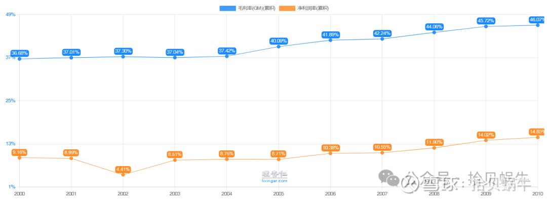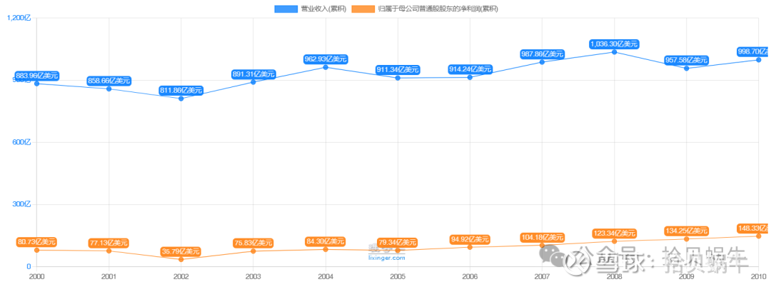 这十年间,IBM的营收基本维持在900亿美元左右,而归母净利润从2000年的80亿增长到了2010年的148亿。