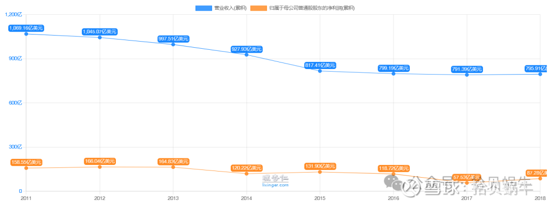 营收从2011年的1069亿下滑至2018年的795亿,归母净利润从2011年的158亿下滑至2018年的87亿。