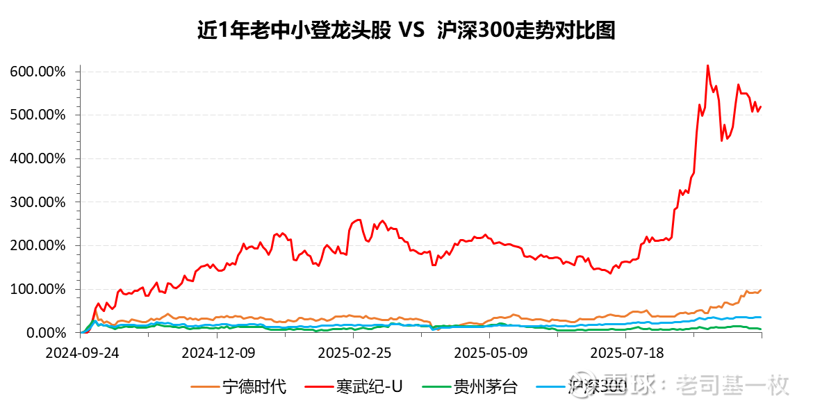 老登代表“老钱”,中登、小登代表“新钱”。从近1年股价走势来看,中登小登是全面吊打老登。截至9月24日,老登(茅台)近1年涨幅仅为8.8%,同期沪深300上涨36%,中登(宁德)大涨98%,小登(寒武纪)飙涨519%。