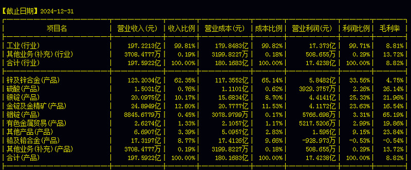 2024年报里面,金锭和银锭的利润占比近50%,锌利润占比33%,半导体行业用的铟锭(产品)利润也有5700万元。水 口山采矿区金、银、铜、锌的的资源储量也很高。