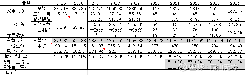 我前面提到,格力的多元化是技术相关的多元化,是向上游产业链延伸的多元化,因此格力在智能装备、工业制品和绿色能源板块的不少产品是自产自用了,在格力合并利润表的营收科目中会进行抵消计算。