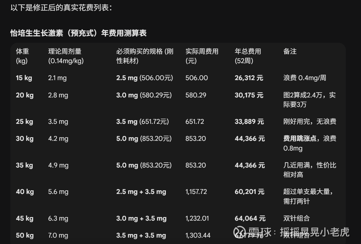 其次,能力圈我是敬佩的,但是我觉得他算错了,所以我找GPT Plus和Gemini Pro双重验证,结合各方面的数据重新算了一下怡培生长激素的年花费价格。