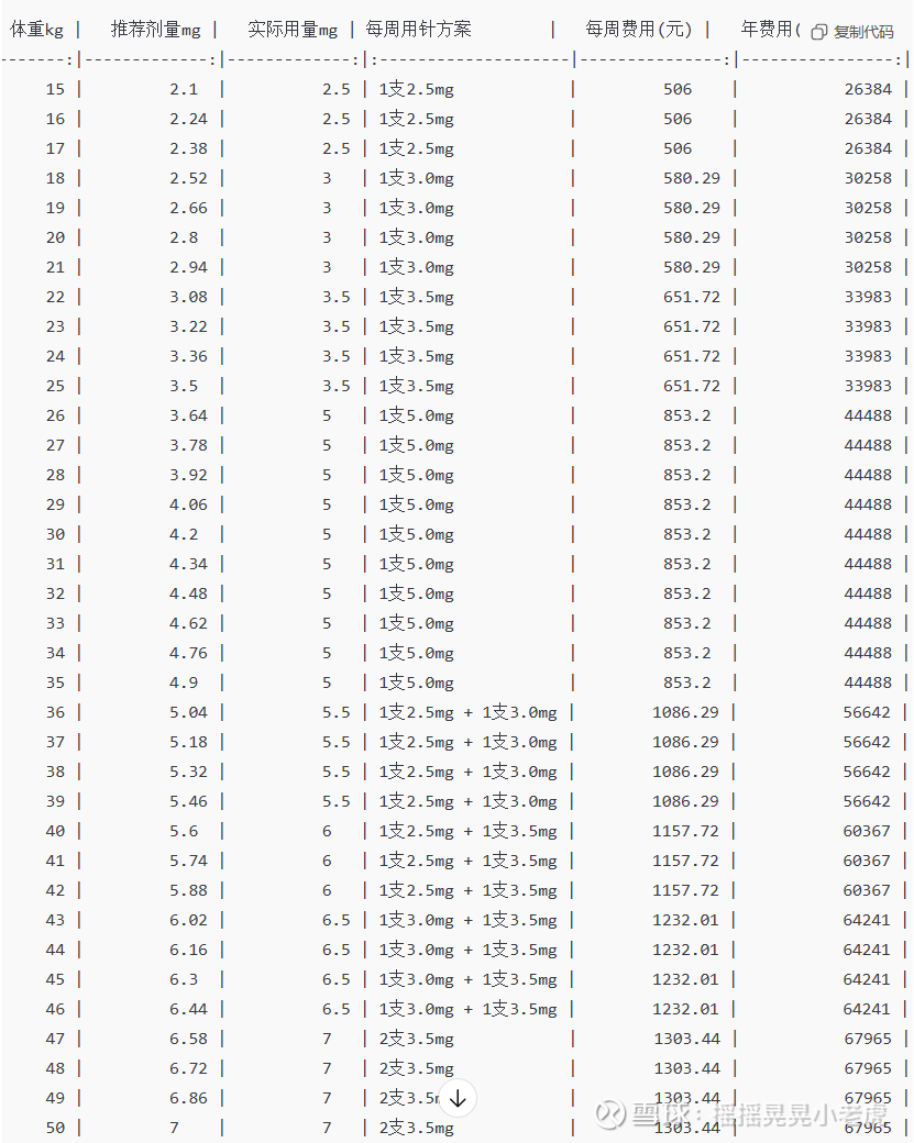 到了30kg,需求4.2mg,3.5mg的针不够了,必须直接跳档买最贵的5.0mg的针(因为中间没有4.0mg或4.5mg规格)。
