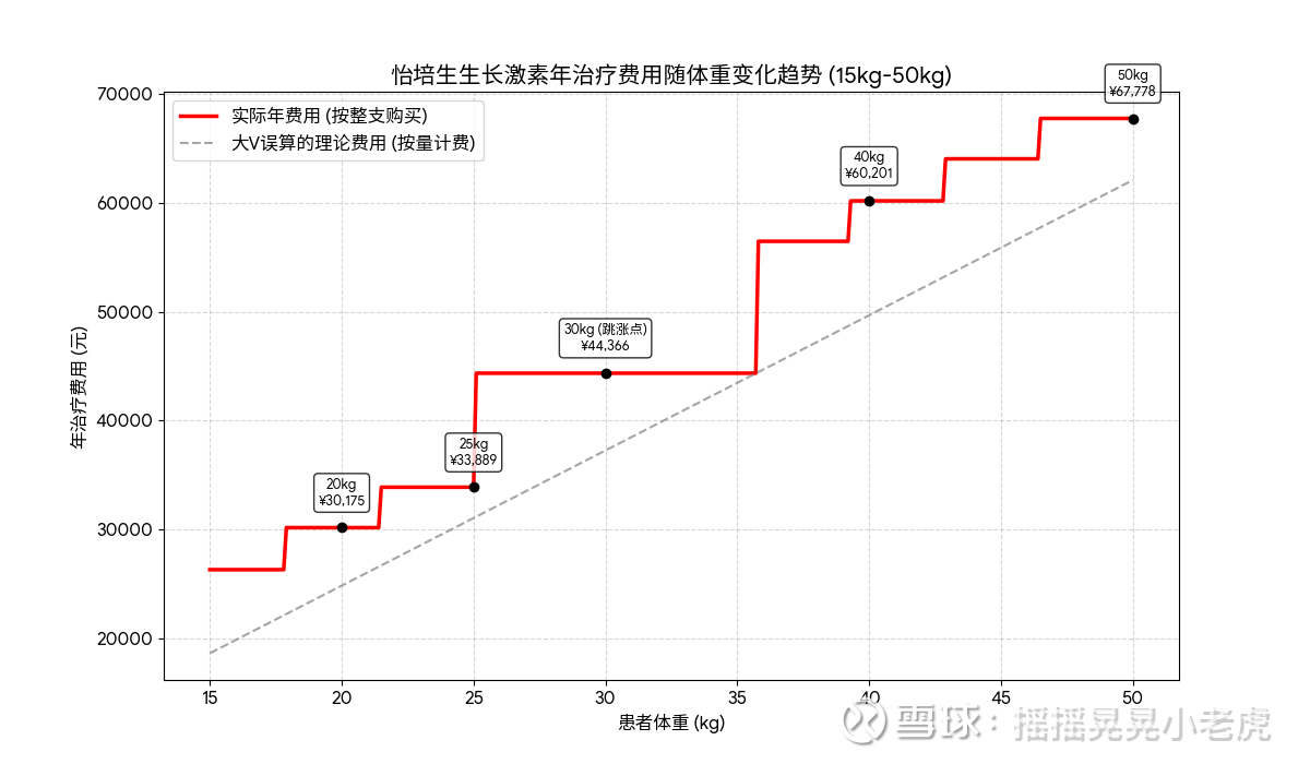 图二的误导性: 对于20kg的孩子,能力圈算出的年费用是 24,913元。他使用的是理想化的数学除法(假设5mg的药能精准分给20kg的孩子用约1.8次)。 现实情况是:20kg孩子需要2.8mg,必须买3.0mg规格的针。每周费用580.29元,年费用 30,175元。 误差幅度:真实费用比大V计算的高出了 21%。