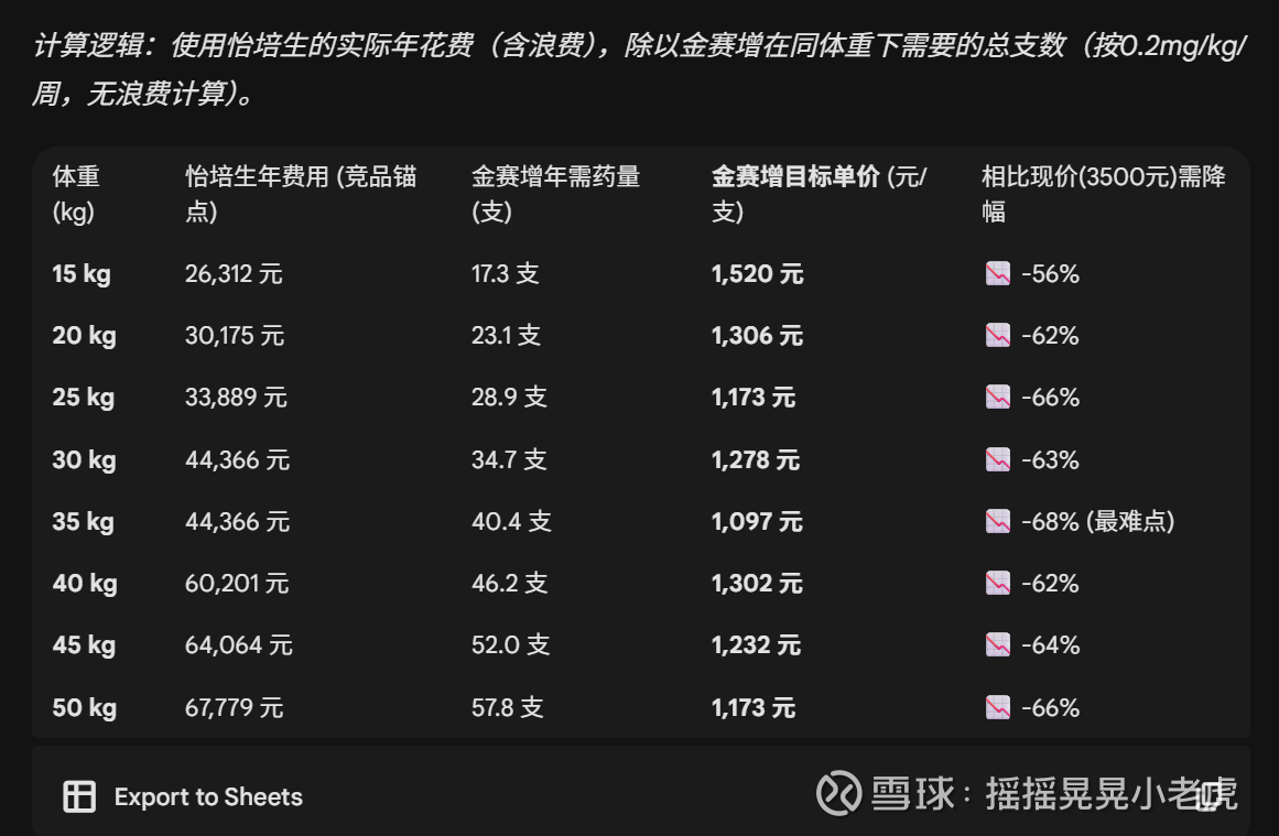 计算逻辑:使用怡培生的实际年花费(含浪费),除以金赛增在同体重下需要的总支数(按0.2mg/kg/周,无浪费计算)。