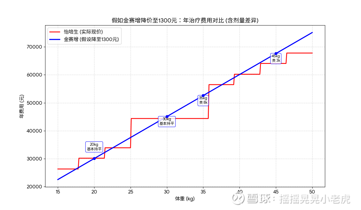 30kg(金赛增反杀):这是最经典的一刻。怡培生被迫跳档到5.0mg,费用瞬间飙到4.4万。而金赛增平滑过渡,仅需4.5万(几乎持平)。考虑到金赛增更灵活,此时金赛增性价比更高。