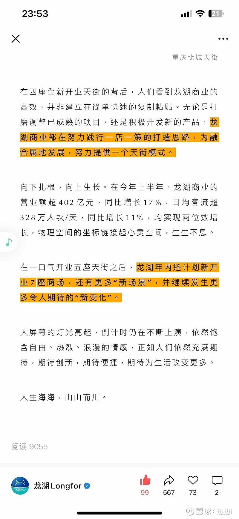 $龙湖集团(00960)$ 公众号说年内开再开7座商业,不知道是否包含了两座欢肆? 杭州欢肆9.30已开了阿,还是说包含了调改商场,欢迎补充新开业的天街。1. 武汉新荣10.172.济南西客站10.313.西安长乐天街10.314.杭州上城11.275.郑州天街.12月