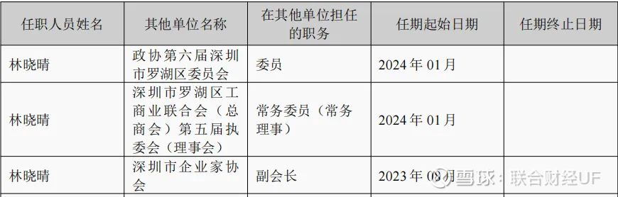 现在除了是上市公司董事长,林晓晴还是政协第六届深圳市罗湖区委员会委员、深圳市罗湖区工商业联合会(总商会)第五届执委会(理事会)常务委员(常务理事)、深圳市企业家协会副会长。