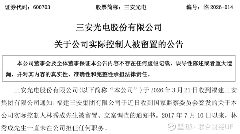 这个周末资本市场比较轰动的一件事,是三安光电公告实控人林秀成被留置、立案调查。