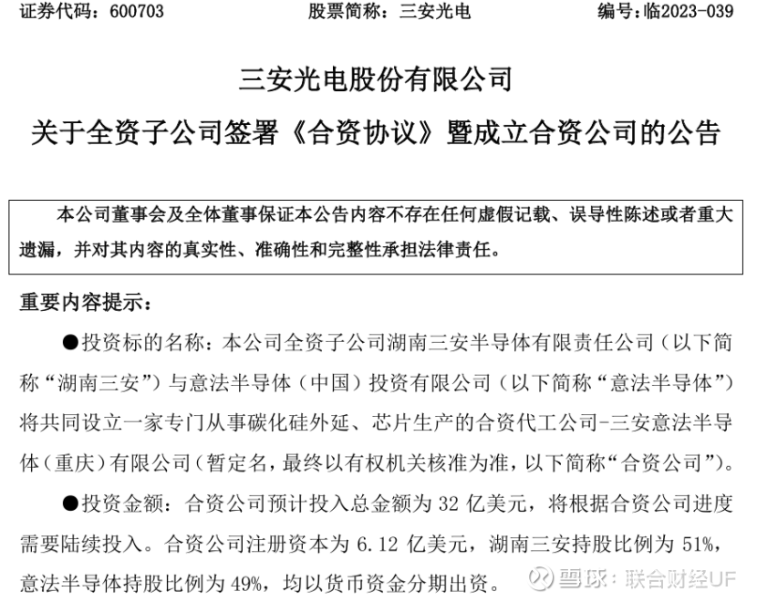 据《重庆日报》报道,2023年6月9日,三安光电与总部设在瑞士日内瓦的国际半导体整合元件制造厂意法半导体(STMicroelectronics)在渝签署碳化硅项目合作协议。重庆市政府外事办公室主办的《重庆与世界》杂志文章指出,三安意法半导体项目是重庆在半导体领域的旗舰项目。