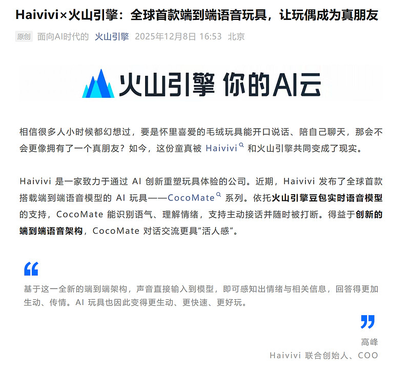 🔥 事件: Haivivi与火山引擎联合推出全球首款端到端AI语音玩具,实现了低延迟、高拟人化的实时语音交互,标志着AI玩具从概念走向规模化落地