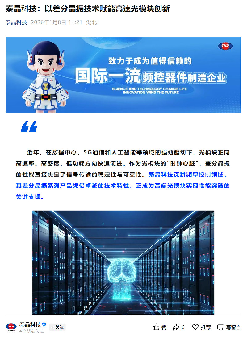 深耕频率控制领域,其差分晶振系列产品凭借卓越的技术特性,正成为高端光模块实现性能突破的关键支撑。