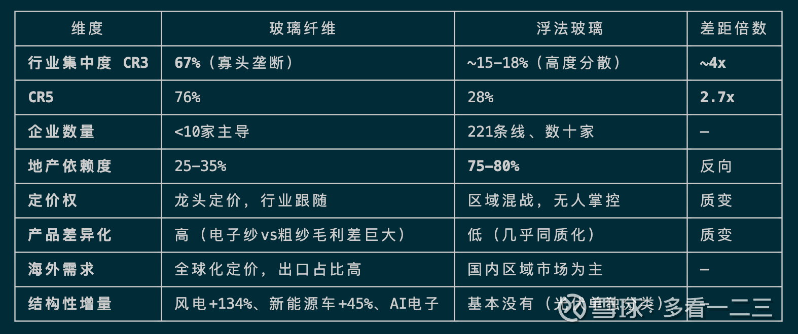 1. 行业格局比估值更重要。同为建材周期股,玻纤CR3=67%用18个月完成利润翻倍+股价2-4倍,浮法CR5=28%磨底15个月仍未反转。买周期股,先看集中度。