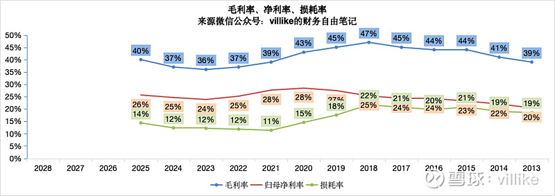 损耗率有一定增加,到达14%,我看利润表里也没什么特别的地方,就是这里多一点那里少一点,比如管理费用3个亿,增长21%(但占比很低),最后的归母扣非净利润38亿,增长15%,归母净利率26%,也连续两个半年回升,但没有毛利率那么明显,放一张图看得更清楚。