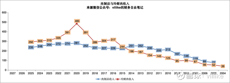 更麻烦的是,去年肉制品营收下滑了5%,猪肉下滑了4%,这两个老本行业务都在下滑,也是持续几年了,看看下图。