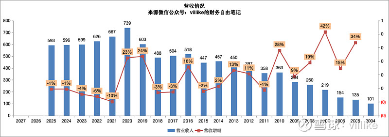 2、关键比例不达标,背后的问题就是业务没有增长,2025年双汇营收593亿,相比去年略有下滑,这已经是连续5年的营收下滑了,虽然这几年下滑都不多,但营收不增长,确实是个明显的问题,见下图。