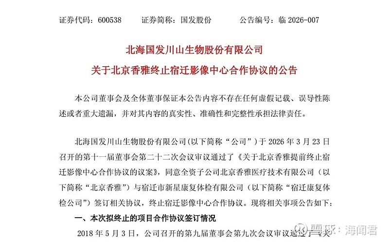 3月23日,国发股份的一纸公告,宣告了其寄予厚望的宿迁影像中心项目彻底画上句号。公司董事会审议通过,全资子公司北京香雅医疗技术有限公司提前终止与宿迁市新星康复体检有限公司的合作协议。