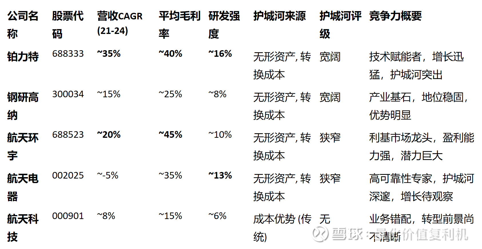 表:关键公司财务与护城河比较计分卡