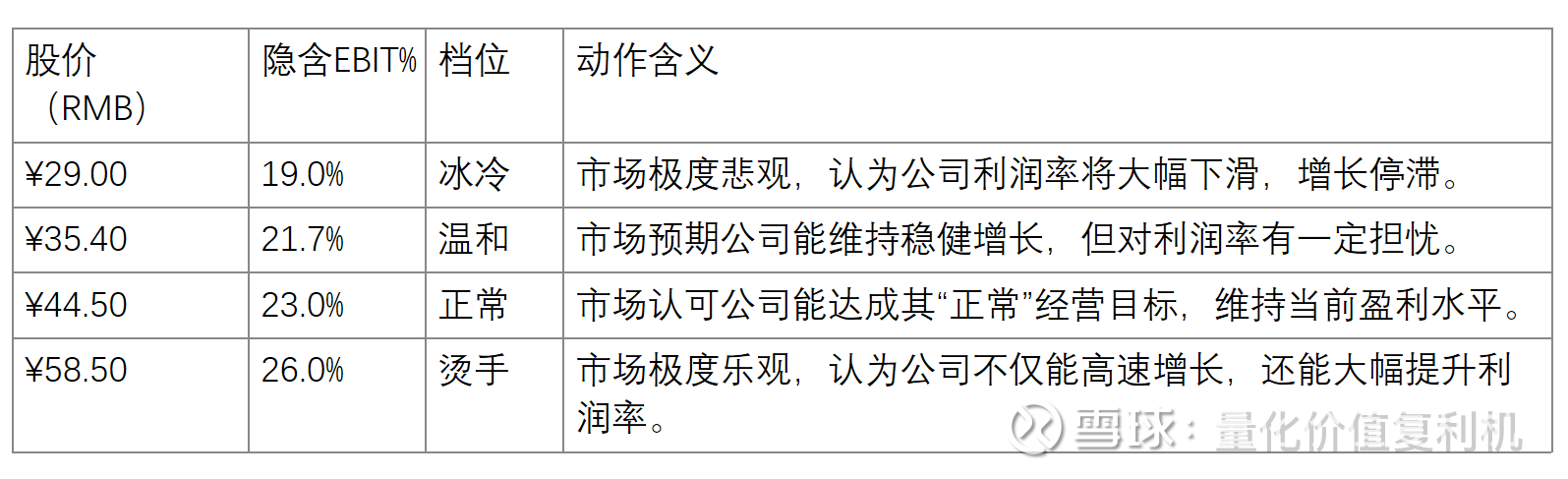 📈 估值热度表(价位→隐含EBIT%→动作含义)