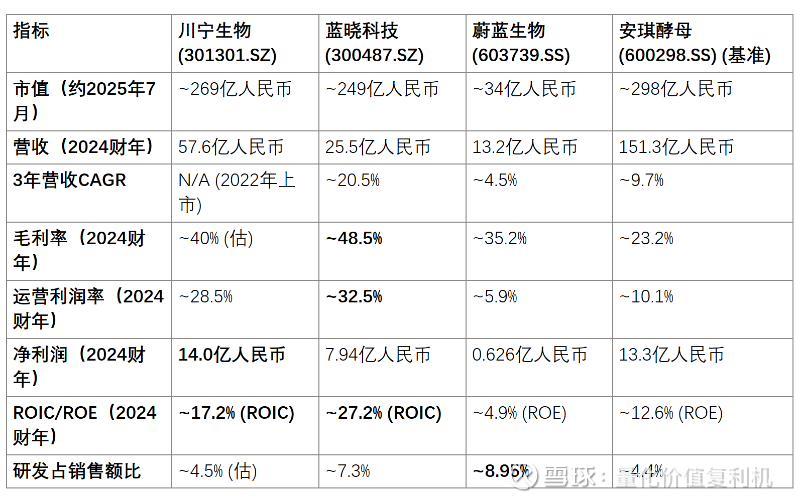 注:部分数据基于可得财报和分部数据估算。川宁生物因上市较晚无3年CAGR。蔚蓝和安琪的ROE用作ROIC的参考。
