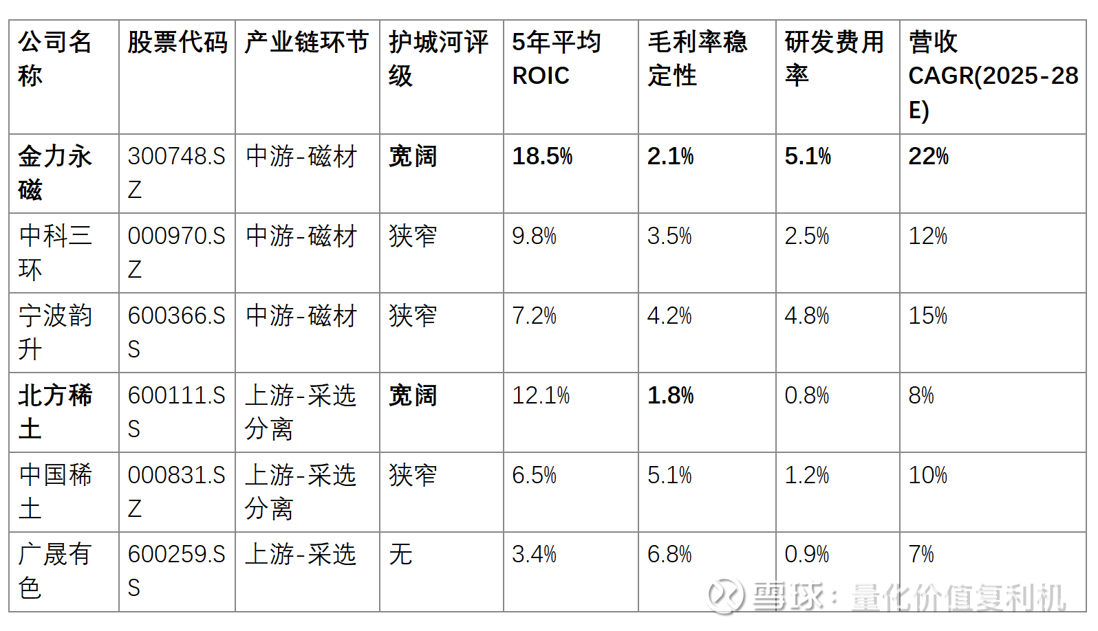 ·北方稀土:护城河宽阔但增长平稳,作为上游资源垄断者,盈利稳定性强但成长性受限。