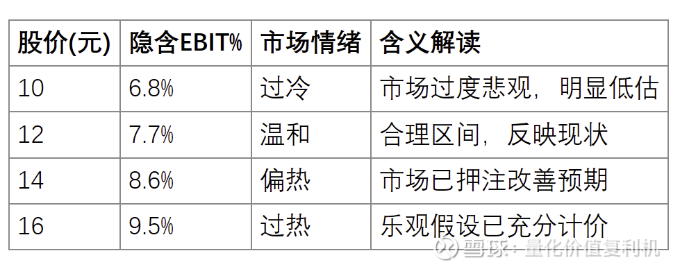 估值现状:当前股价14元左右,市场已计入较乐观预期,隐含EBIT利润率约8.6%