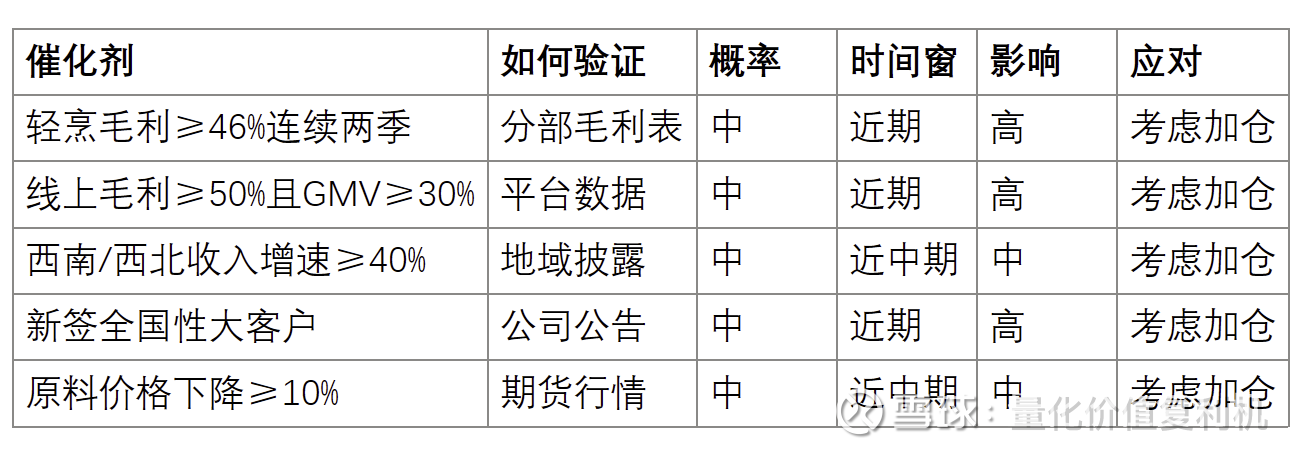 积极信号:如果轻烹毛利率能连续两个季度回升到46%以上,同时西南地区收入增速超过40%,说明公司成长逻辑正在兑现,可能迎来重估窗口