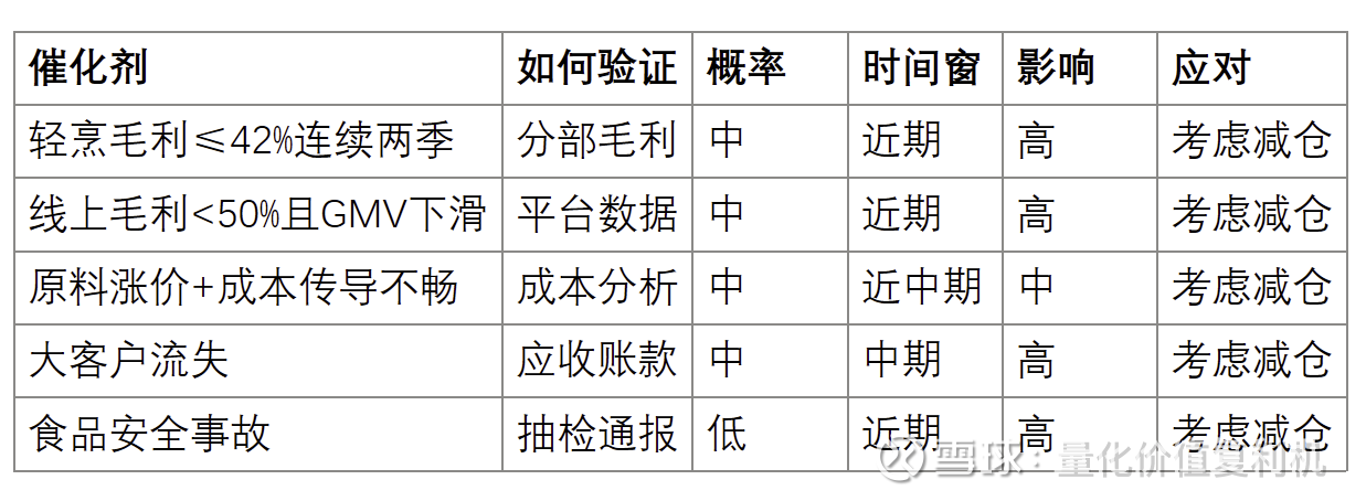 关键触发点很明确:当【轻烹毛利率稳定在46%以上】、【线上业务毛利率保持在50%以上】并且【新产能达产率超过85%】这三个条件同时满足时,才是真正的“重估窗口”开启之时。