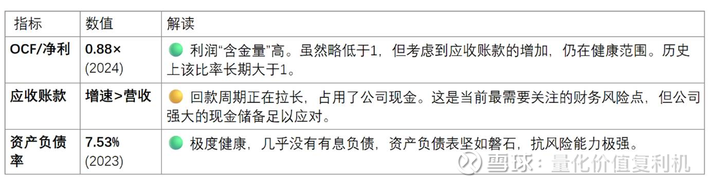现金转换能力:公司的经营现金流一直很健康,历史上大部分时间都高于净利润,说明赚到的都是真金白银。但近期有一个值得警惕的信号:应收账款正在增加。2024年应收账款同比增长了17.5%,公司解释是地缘政治导致出口账期拉长。这会侵蚀公司的现金流,需要密切关注。