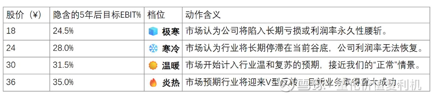 我们的基准情景(正常)假设公司长期EBIT利润率将恢复至 30% 左右。因此,当股价处于¥24附近或以下时,意味着市场预期比我们的基准情景还要悲观,有可能存在低估机会。