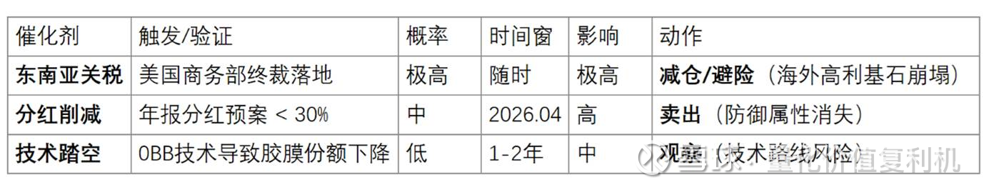 保守(30%):内卷陷阱。光伏胶膜彻底沦为大宗商品,价格战无休无止。海外产能因关税失效。公司仅能维持微利,不再扩产。