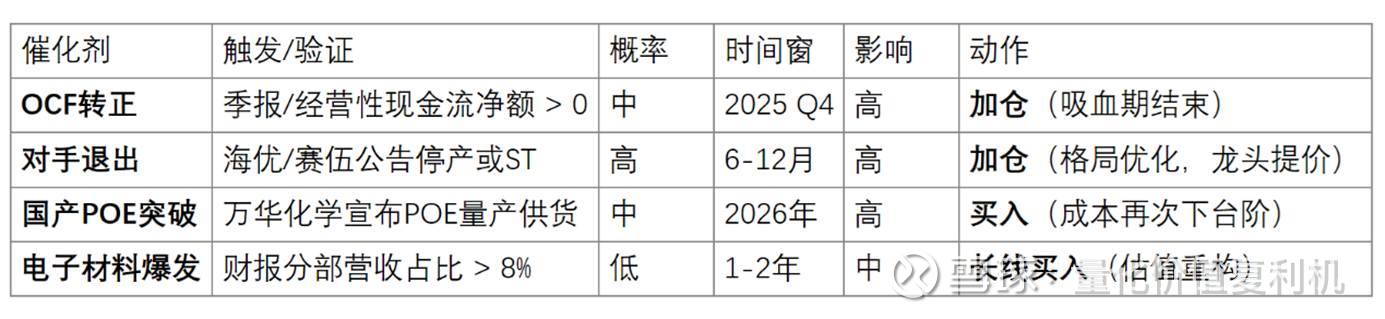关键触发点清单:当【经营性现金流转正】且【毛利率维持14%以上】并【电子材料占比提升】→ 进入“重估窗口”。