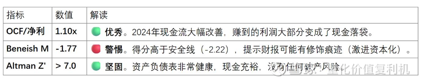 Beneish M-Score 预警:我们的审计发现公司资产质量指数(AQI)偏高,这可能意味着为了美化报表,公司把一些本该费用化的支出资本化了。