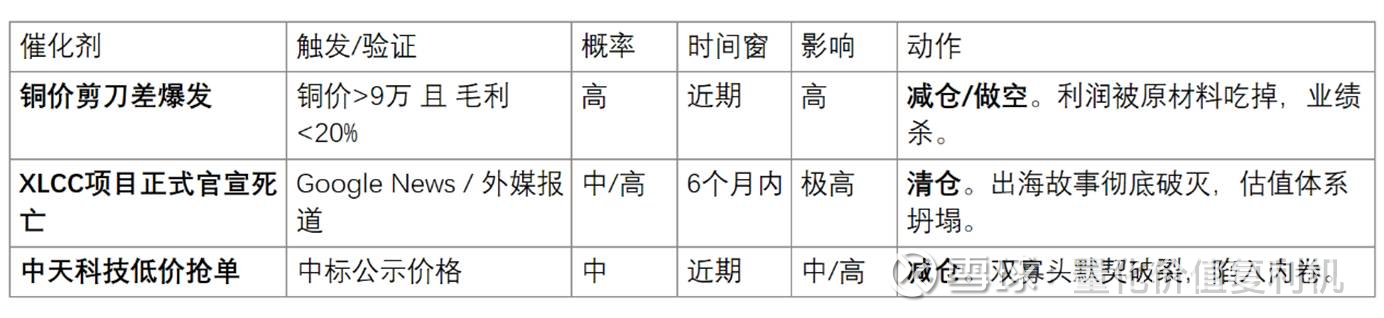 🔴 保守(25%):“铜价陷阱”。铜价飙升,价格传导失效,毛利被压缩。国内竞争加剧,中天科技发起价格战。海外XLCC项目彻底失败。主要赚个辛苦加工费。