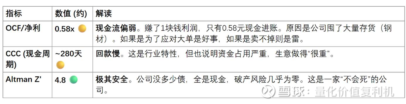 若【经营性现金流 (OCF)】持续低于净利润 → 说明赚的钱都变成了仓库里的钢材(存货积压),利润含金量打折。