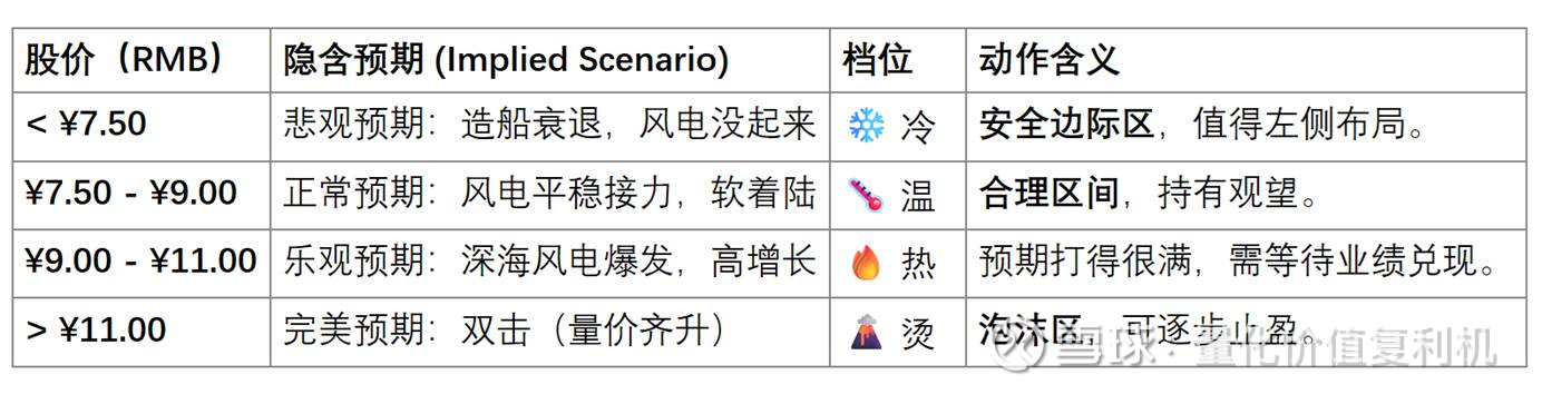 估值热度:偏烫。当前股价已隐含了“深海风电完美爆发”的预期,尚未计入2027年造船订单下滑的风险。