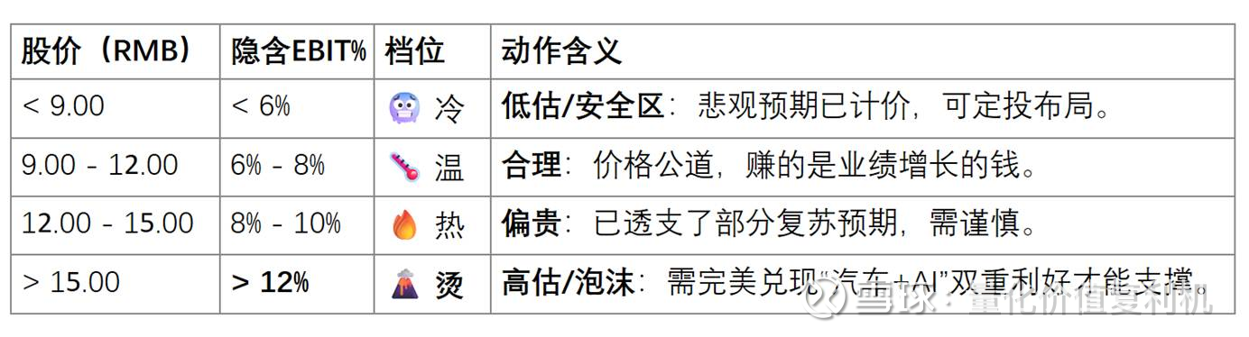 📈 估值热度表(价位→隐含EBIT%→动作含义)