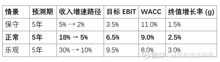 基准假设:WACC(资金成本)= 9.5%,税率 = 15%。