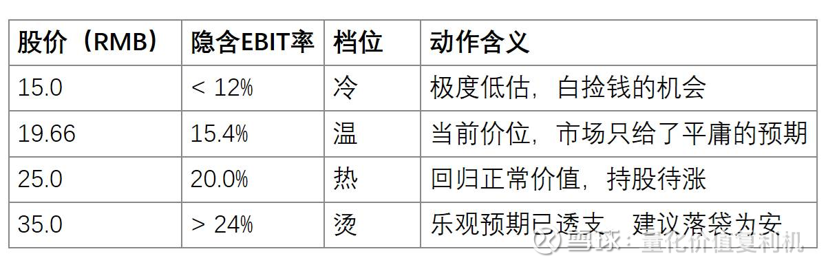 估值热度:当前股价(约19.66元)仅隐含了每年3%的极低增长预期,市场定价正处于“极冷”区间。
