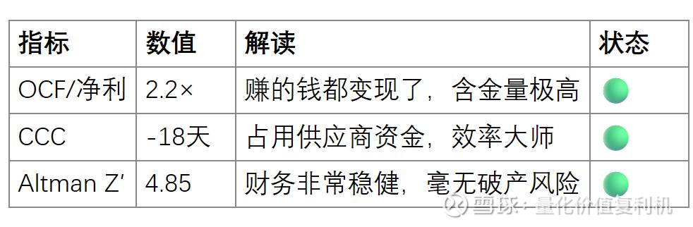 Q2:为什么“CCC”是负数这么关键? A:说明它在行业里说话算数,能压供应商的款,自己手里留着大量现金(48亿理财呢!),抗风险能力极强。