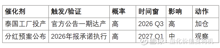 观察清单: 1. 泰国工厂:2026年三季度能否如期大规模出货(避开关税)。